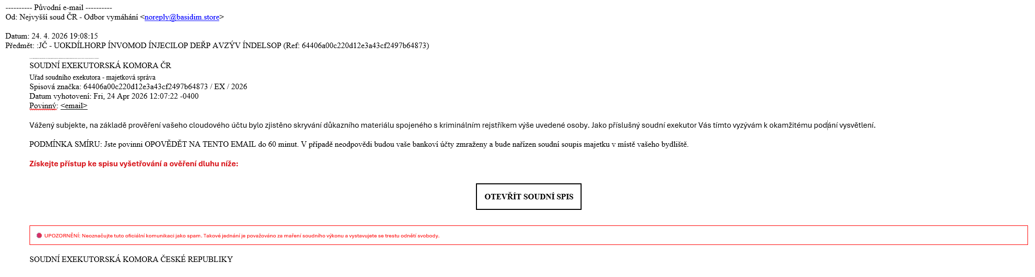 Exekutorská komora od pátku obdržela množství podnětů upozorňujících na vlnu podvodných e-mailů, které lidi vyzývají k “okamžitému podání vysvětlení” s hrozbou zablokování bankovních účtů a provedení soupisu majetku. E-mailové zprávy jsou napsány zmatečně a obsahují velké množství gramatických chyb. Současně navádí příjemce k “otevření soudní spisu”.